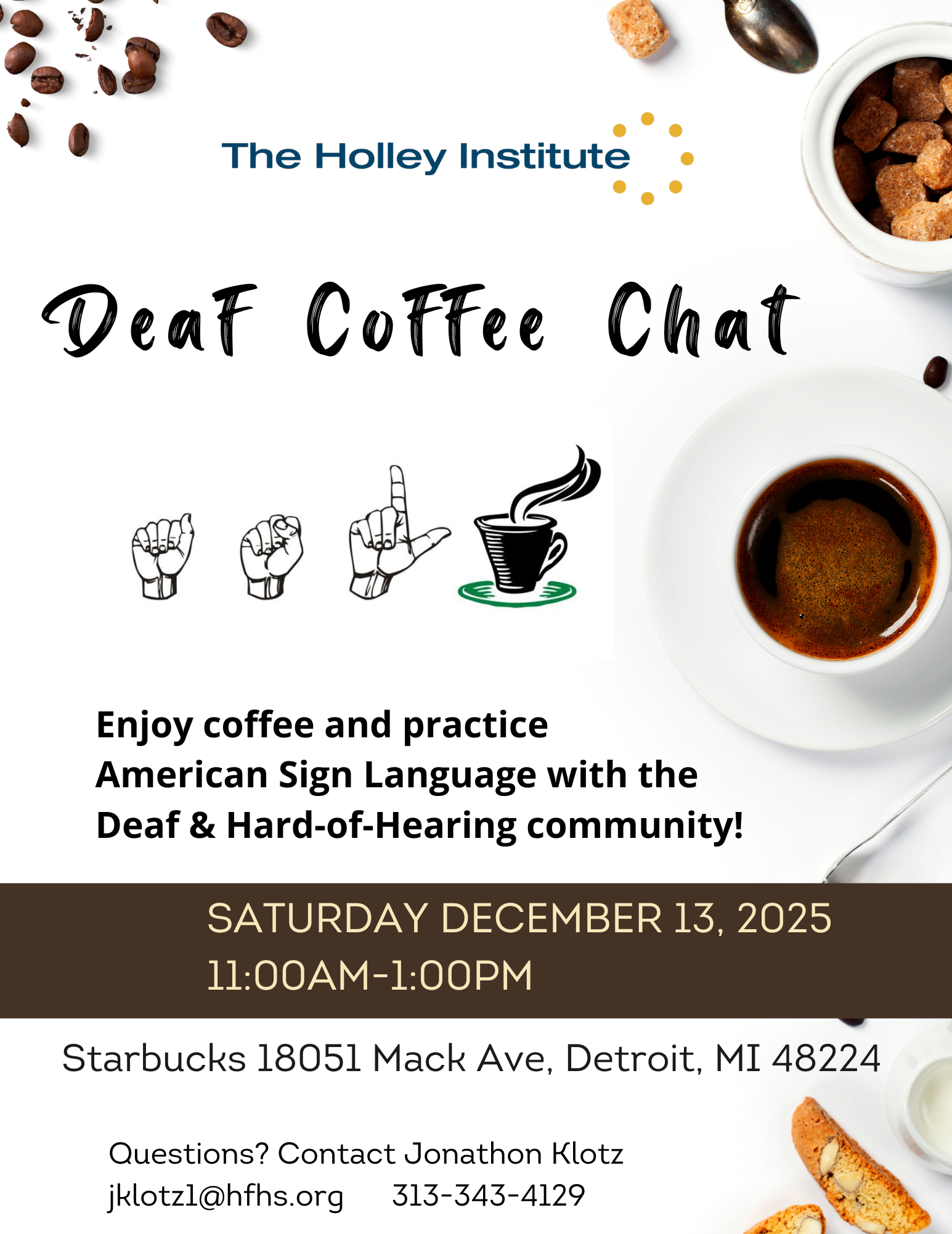 Meet us at Starbucks on Mack Avenue in Detroit to practice American Sign Language (ASL) and socialize with the Deaf and Hard of Hearing community! This free event is open to the public and provides a welcoming space for attendees to use ASL and connect.